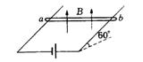 4、计算题 如图所示 ,在与水平方向成60°的光滑金属导轨间连一电源,在相距1m的平行导轨上放一重力为3N的金属棒ab,棒上通以3A的电流,磁场方向竖直向上,这时棒恰好静止。求:(1)ab棒对导轨的压力;(2)匀强磁场的磁感应强度B。