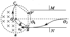 时刻进入电场后向N板偏转,由题意知粒子应刚好平行于N板从N板的边缘水平飞出,并沿着水平方向进入磁场。如图,设粒子从B点进入磁场,从C点射出,O"点为粒子圆周运动的圆心,由(1)知: