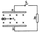 5、填空题 如图所示,a,b为两平行金属板,间距为10 cm,两板间充满磁感应强度为0.5 T的匀强磁场,磁场方向如图所示。开始时,开关S是断开的,等离子体从左向右射入两平行板之间,速度为v0=400 m/s,待稳定后两板之间的电压为___V,S闭合时,流过电阻R的电流方向是___(填“向上”或“向下”)。