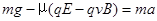 4、计算题 如图所示,空间存在水平向右的匀强电场E和垂直纸面向外的匀强磁场B,一个质量为m、带电荷量为+q的小球套在不光滑的足够长的竖直绝缘杆上,从静止开始下滑。已知滑动摩擦系数为μ.