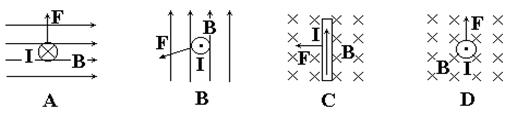 5、选择题 将通电直导线放入磁场中,电流方向、磁场方向及导线的受力方向如下图所示,其中不正确的是