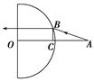 2、计算题 (8分)如图所示,是一透明半圆柱体的横截面,O为横截面的圆心,其半径为R,折射率为,OA水平且垂直截面, 从A点射出一条光线AB经折射后水平射出半圆柱体,已知OA=R,光速为c.求: