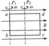 P1和P2以相同的角速度匀速转动,当线圈平面转到与磁场方向平行时