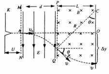 2、计算题 如图所示,K与虚线MN之间是加速电场,虚线MN与PQ之间是匀强电场,虚线PQ与荧光屏之间是匀强磁场,且MN、PQ与荧光屏三者互相平行,电场和磁场的方向如图所示,图中A点与O点的连线垂直于荧光屏.一带正电的粒子从A点离开加速电场,速度方向垂直于偏转电场方向射入偏转电场,在离开偏转电场后进入匀强磁场,最后恰好垂直地打在荧光屏上.已知电场和磁场区域在竖直方向足够长,加速电场电压与偏转电场的场强关系为U=