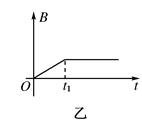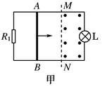 1、选择题 如图甲所示,两根电阻忽略不计的导轨平行放置,导轨左端接电阻R1,右端接小灯泡L,导体棒AB垂直于导轨放置,电阻R1、导体棒AB和小灯泡L的电阻均为R(不计灯泡电阻随温度的变化),虚线MN右侧有垂直导轨平面的磁场,当导体棒AB从MN左侧某处匀速向右运动时开始计时,磁感应强度随时间变化如图乙所示,若导体棒AB从开始运动到穿越磁场的过程中,灯泡的亮度始终不变,则导体棒AB在穿越磁场前后电阻R1上消耗的功率之比是( )