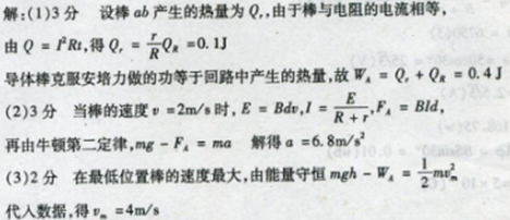 3、计算题 如右图,电阻可忽略的光滑平行金属导轨MN、M′N′固定在竖直方向,导轨间距d=0.8m,下端NN′间接一阻值R=1.5Ω的电阻,磁感应强度B=1.0T的匀强磁场垂直于导轨平面.距下端h=lm高处有一金属棒ab与轨道垂直且接触良好,其质量m=0.2kg,电阻r=0.5Ω,由静止释放到下落至底端NN′的过程中,电阻R上产生的焦耳热QR =0.3J.g=10m/s2.求: