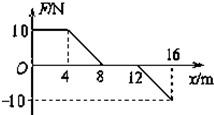 5、选择题 物体在变力F作用下沿水平方向做直线运动,物体质量m=10kg,F随坐标x的变化情况如图所示.若物体在坐标原点处由静止出发,不计一切摩擦.借鉴教科书中学习直线运动时由v-t图象求位移的方法,结合其他所学知识,根据图示的F-x图象,可求出物体运动到x=16m处时,速度大小为( )