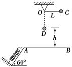 3、计算题 如图所示,在同一竖直平面内,一轻质弹簧一端固定,另一自由端恰好与水平线AB平齐,静止放于倾角为60°的光滑斜面上。一长为L=10cm的轻质细绳一端固定在O点,另一端系一质量为m=1 kg的小球,将细绳拉至水平,使小球在位置C由静止释放,小球到达最低点D时,细绳刚好被拉断。之后小球在运动过程中恰好沿斜面方向将劲度系数为k=100N/m的弹簧压缩,已知弹簧的弹性势能EP与弹簧的劲度系数k及弹簧的形变量x的关系式为