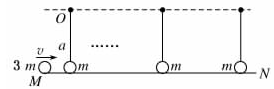 2、选择题  如图,长为a的轻质细线,一端悬挂在O点,另一端接一个质量为m的小球(可视为质点),组成一个能绕O点在竖直面内自由转动的振子.现有3个这样的振子,以相等的间隔b(b>2a)在同一竖直面里成一直线悬于光滑的平台MN上,悬点距台面高均为a.今有一质量为3m的小球以水平速度v沿台面射向振子并与振子依次发生弹性正碰,为使每个振子碰撞后都能在竖直面内至少做一个完整的圆周运动,则入射小球的速度v不能小于(? )