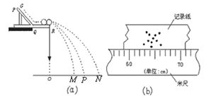 5、实验题  某同学用如图所示的(a)图装置来探究碰撞中的守恒量,图中PQ是斜槽,QR为水平槽,(b)图是多次实验中某球落到位于水平地面记录纸上得到10个落点痕迹,有关该实验的一些说法,不正确的有