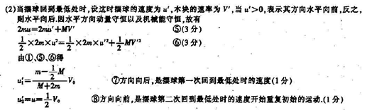 (2)铁块从小车右端滑离小车时,小车的速度最大为V1,此时铁块速度为V2,由动量守恒定律得: mv=MV1 + mV2? ?③(1分)