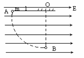 5、计算题 (本题6分)如图所示,水平向右的匀强电场场强为E,有一绝缘轻细杆长为l,一端可绕O点在竖直面内无摩擦转动,另一端粘有一带正电荷的小球,电量为q,质量为m,将小球拉成与O点等高的A点后自由释放,求小球到达最低点B时绝缘杆给小球的力。