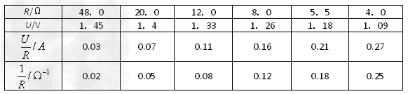 5、实验题 利用如图甲所示的电路测量某电池的电动势E和内电阻r,图中R是电阻箱,R0是阻值为1.0Ω的定值电阻。闭合电键S,调节电阻箱的阻值,记录电阻箱的示数R和电压表相应的示数U,记录数据如表所示。为了较方便准确地得到实验结论,可用图像法来处理实验数据,若图像的纵坐标表示电压表的示数U,则图像横坐标表示的物理量应是? (请从数据表格中选择),利用表中的数据在图乙所示的坐标纸中画出图像,根据图像可求得电源的电动势E=?V,电源的内电阻r=?Ω。(结果保留二位小数)