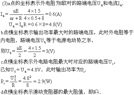 5、简答题 如图所示,电源由几个电动势均为1.5V,内阻相同的电池串联而成.闭合电键K,变阻器触头C由A端到B端的过程中,电路中的一些物理量的变化由下图表示出.求:(1)电池的个数和每个电池的内阻;(2)变阻器的最大阻值;(3)在各图象中填上a、b、c、d诸点的坐标.