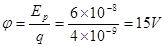 4、计算题 把q1= 4×10-9C的试探电荷放在电场中的A点,具有6×10-8J的电势能,求A点的电势.若把q2= -2×10-10C的试探电荷放在电场中的A点,电荷所具有的电势能是多少?
