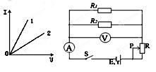 2、选择题 如图所示为两电阻R1和R2的伏安特性曲线。将电阻R1和R2接入如右图所示电路中,闭合开关s后,当滑动变阻器触片P向下移动时,则(?)