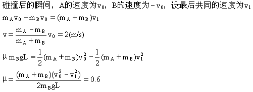 =4m/s的速度向右运动.右面有一固定的墙壁,A与墙壁碰撞时间极短,碰撞后以原速率向左运动,而B则仍向右运动.由于A、B间有摩擦力,最后B恰停在A的右端而没有掉下来.求AB间的动摩擦因数.(取g=10m/