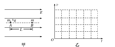 4、计算题 在电场强度为E的匀强电场中,有一条与电场线平行的几何线(如图甲中虚线所示),几何线上有两个静止的小球A和B(均可视为质点),两小球的质量均为m,A球带正电,电荷量为q(电荷量很小,对原电场的影响可忽略);B球不带电,开始时两球相距为L.某时刻释放A球,A球在电场力的作用下开始沿直线运动,并与B球发生正对碰撞.设碰撞中A、B两球的总动能无损失,且A、B两球间无电荷转移,不考虑重力及两球间的万有引力,不计碰撞时间:求: