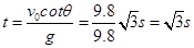 5、选择题 如图所示,以初速度9.8m/s水平抛出的物体,飞行一段时间后垂直撞在倾角为