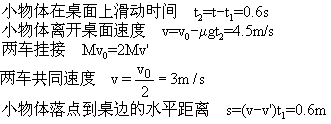 6.0m/s沿平直轨道匀速滑行.在车厢内高h=0.8m的水平桌面上,有一个小物体桌面上,有一个小物体随车厢一起运动.小物体与桌面间的动摩擦因数μ=0.25.车厢A与原来静止的车厢B碰撞挂接.挂接后两车厢仍共同作匀速运动.从挂接到小物体落到车厢地板上共经历时间t=1s.已知A车厢总质量与B车厢质量相等.g取10m/