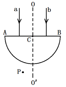 3、选择题 (6分)如图所示为半圆形的玻璃砖,C为AB的中点,OO"为过C点的AB面的垂线。a、b两束不同频率的单色可见细光束垂直AB边从空气射入玻璃砖,且两束光在AB面上入射点到C点的距离相等,两束光折射后相交于图中的P点,以下判断正确的是(?)