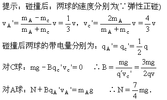 2、简答题 如图,在光滑的绝缘平面上方,有垂直纸面向里的匀强磁场,一质量为m、带有电量+q的钢球C静止放于平面上,另一质量为2m、与C球等大的不带电的钢球A,以速度v与C球发生弹性正碰.碰后C球对平面刚好无压力.则此时A球对平面的压力大小为多少?
