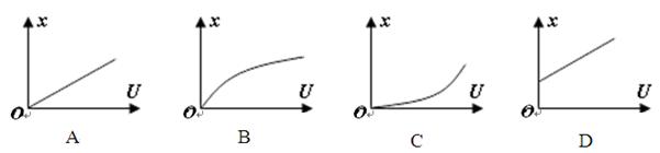 1、选择题 如图所示,一个静止的质量为m,带电量为+q的带电粒子(不计重力),经电压U加速后垂直进入磁感应强度为B的匀强磁场中,粒子打至P点,设OP=x,能正确反映x与U之间函数关系的x—U图如图中的( )