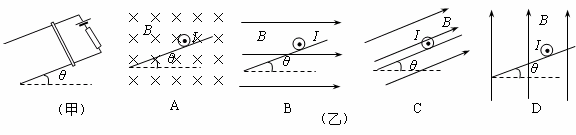 2、选择题 如图(甲)所示,两平行导轨与水平面成θ角倾斜放置,电源、电阻、金属细杆及导轨组成闭合回路。细杆与导轨间的摩擦不计,整个装置分别处在如图(乙)所示的匀强磁场中,其中可能使金属细杆处于静止状态的是