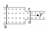 3、简答题 如图,水平平面内固定两平行的光滑导轨,左边两导轨间的距离为2L,右边两导轨间的距离为L,左右部分用导轨材料连接,两导轨间都存在磁感强度为B、方向竖直向下的匀强磁场。ab、cd两均匀的导体棒分别垂直放在左边和右边导轨间,ab棒的质量为2m,电阻为2r,cd棒的质量为m,电阻为r,其它部分电阻不计。原来两棒均处于静止状态,cd棒在沿导轨向右的水平恒力F作用下开始运动,设两导轨足够长,两棒都不会滑出各自的轨道。