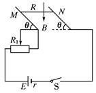 1、计算题 如右图所示,两平行光滑导轨相距为20 cm,金属棒MN的质量为10 g,电阻为8 Ω,匀强磁场的磁感应强度B=0.8 T,方向竖直向下,电源电动势E=10 V,内阻r=1 Ω,当开关S闭合时,MN恰好平衡,求变阻器R1的取值为多少?(设θ=45°,g取10 m/s2)
