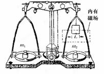 4、计算题 如图所示的天平可用来测定磁感应强度,天平的右臂下面挂有一个矩形线圈,宽为L,共N匝,线圈下部悬在匀强磁场中,磁场方向垂直纸面,当线圈中通有电流I时,方向如图,在天平左右两盘各加质量分别为m1、m2的砝码,天平平衡,当电流反向时(大小不变),右盘再加上质量为m的砝码后,天平重新平衡,试: