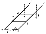 4、计算题 导电的正方形线框abcd边长为l,每边的电阻均为r0,线框置于光滑水平导轨oo"与nn"上,导轨间距也为l,电阻不计,on端所接电池的电动势为ε,内阻为r,整个装置处在磁感强度大小为B方向向下的匀强磁场中。现将电键s闭合,求s闭合瞬间: