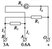 5、计算题 如图为实验室常用的两个量程的电流表原理图.当使用O、A两接线柱时,量程为0.6 A;当使用O、B两接线柱时,量程为3 A.已知电流计的内阻Rg=200 Ω,满偏电流Ig=100 mA.求分流电阻R1和R2的阻值.