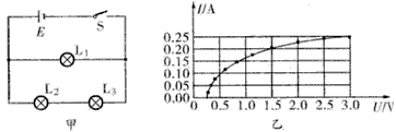 3、选择题 在如图甲所示的电路中,电源电动势为3.0 V,内阻不计,L1、L2、L3为3个相同规格的小灯泡,这种小灯泡的伏安特性曲线如图乙所示。当开关闭合后,下列判断正确的是