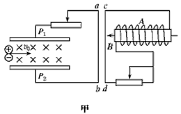 1、选择题 等离子气流由左方连续以v0射入P1和P2两板间的匀强磁场中,ab直导线与P1、P2相连接,线圈A与直导线cd连接。线圈A内有随图乙所示的变化磁场,且磁场B的正方向规定为向左,如图甲所示,则下列叙述正确的是?