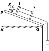 4、实验题 像打点计时器一样,光电计时器也是一种研究物体运动情况的常见计时仪器,每个光电门都是由激光发射和接收装置组成。当有物体从光电门通过时,光电计时器就可以显示物体的挡光时间。现利用如图11所示装置设计一个“探究物体运动的加速度与合外力、质量关系”的实验,图中NQ是水平桌面、PQ是一端带有滑轮的长木板,1、2是固定在木板上间距为L的两个光电门(与之连接的两个光电计时器没有画出)。可以装载钩码的小车上固定着用于挡光的窄片K,让小车从木板的顶端滑下,光电门各自连接的计时器显示窄片K的挡光时间分别为t1和t2。
