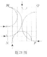 2、选择题 如题图所式,矩形MNPQ区域内有方向垂直于纸面的匀强磁场,有5个带点粒子从图中箭头所示位置垂直于磁场边界进入磁场,在纸面内做匀速圆周运动,运动轨迹为相应的圆弧,,这些粒子的质量,电荷量以及速度大小如下表所示。