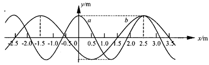 1、计算题  有两列简谐横波a、b在同一媒质中沿x轴正方向传播,波速均为v=2.5m/s。在t=0时,两列波的波峰正好在x=2.5m处重合,如图所示。
