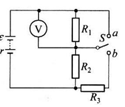 1、计算题 如图所示电路中,电源的电动势ε=16V,电阻R1=R2=R3=10Ω,电源内阻r=1Ω.求下述各种情况中电压表的示数(电压表的内阻非常大,流过电压表的电流可忽略不计).