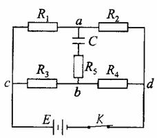 5、计算题 如图所示电路中,电源电动势E=10v,内电阻不计,电阻R1=14Ω,R2=6.0Ω,R3=2.0Ω,R4=8.0Ω,R5=10Ω,电容器的电容C=2μF,求:
