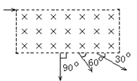 4、选择题  三个速度大小不同的的同种带电粒子,沿如图所示长方形区域匀强磁场的上边缘射入,当它们从下边缘飞出时,对入射方向的偏角分别为900、600、300,则它们在磁场中运动时间之比为?
