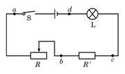 4、选择题  用电压表检查图示电路中的故障,测得Uad=5.0 V,Ucd=0 V,Ubc=0 V,Uab=5.0 V,则此故障可能是