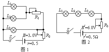 5、计算题 三只灯泡L1、L2和L3的额定电压分别为1.5 V、1.5 V和2.5 V,它们的额定电流都为0.3 A。若将它们连接成图1、图2所示电路,且灯泡都正常发光,