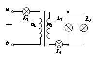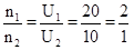 本题解析:L2、L3并联后与L4串联,灯泡正常发光.说明副线圈电压为10V,副线圈功率为20W,根据电压与匝数成正比,可以求得副线圈的匝数,根据变压器的输入的功率和输出的功率相等可以求得原线圈的输出功率,根据L1、正常发光得出电流,从而得出ab间电压,再求出原线圈电压,根据电压与匝数成正比,可以求得匝数比.