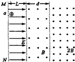 3、简答题 如图所示,水平方向的匀强电场的场强为E,场区宽度为L,紧挨着电场的是垂直纸面向外的两个匀强磁场区域,其磁感应强度分别为B和2B,三个场的竖直方向均足够长.一个质量为m,电量为q的带正电粒子,其重力不计,从电场的边界MN上的a点由静止释放,经电场加速后进人磁场,穿过中间磁场所用的时间t0=