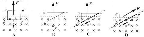 2、选择题 如图所示,闭合线框以一定速度进入有理想边界的匀强磁场,下列对线框所受安培力F的方向判断正确的是