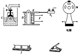 5、作图题 如图所示,A是浮子,B是金属触头,C为住宅楼房顶上的蓄水池,M是带水泵的电动机,D是弹簧,E是衔铁,F是电磁铁,S1、S2分别为触头开关,S为开关,J为电池。请利用上述材料,设计一个住宅楼房顶上的自动注水装置。?