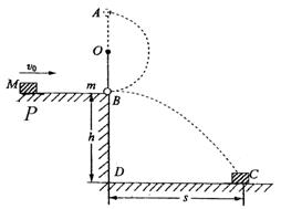 4、计算题 如图所示,固定点O上系一长l=0.6m的细绳,细绳的下端系一质量m=1.0kg的小球(可视为质点),原来处于静止状态,球与平台的B点接触但对平台无压力,平台高h=0.80m,一质量M=2.0kg的物块开始静止在平台上的P点,现对M施予一水平向右的瞬时冲量,物块M沿粗糙平台自左向右运动到平台边缘B处与小球m发生正碰,碰后小球m在绳的约束下做圆周运动,经最高点A时,绳上的拉力恰好等于摆球的重力,而M落在水平地面上的C点,其水平位移s=1.2m,不计空气阻力.g=10m/s2 .求:
