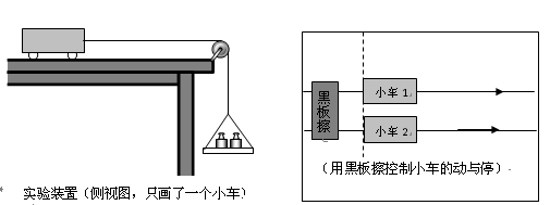 两小车及其中砝码的总质量分别记为m1、m2,两个小盘及其中砝码所受的总重力分别记为G1、G2,实验中,从右图所示位置由静止开始抬起黑板擦又放下,两小车通过的位移分别为x1、x2。则根据以上数据: