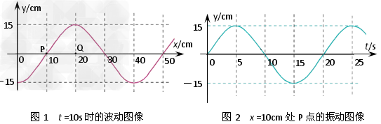 1、计算题  图1为某波动在t =10s时的图像,图2为图1中x =10cm处P点的振动图像。根据图示信息回答下列问题。